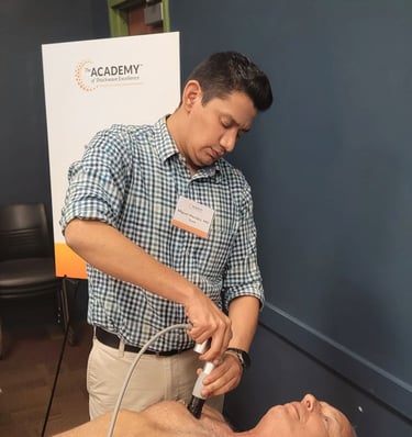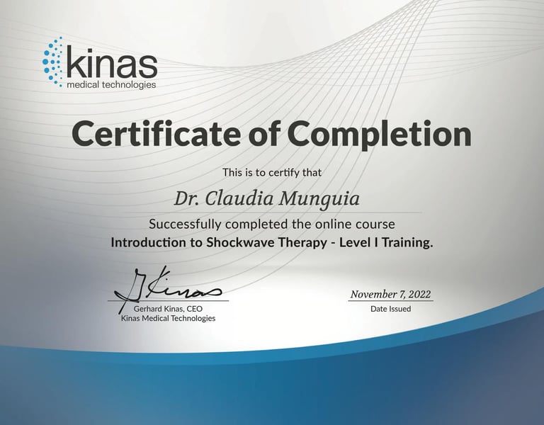 Posteriormente, en 2023, recibió una certificación en Terapia de Shockwave en Estados Unidos, ampliando su experiencia en el manejo integral del dolor y la rehabilitación funcional.