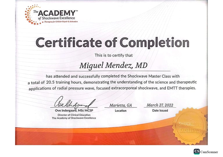 Ha recibido entrenamiento especializado en Shockwave Academy, en Atlanta, Estados Unidos, y ha participado en el Congreso Internacional de Shockwave en Austria, acumulando más de cinco años de experiencia clínica en el uso de terapia de ondas de choque (Shockwave Therapy) para el manejo del dolor, rehabilitación funcional y medicina deportiva.