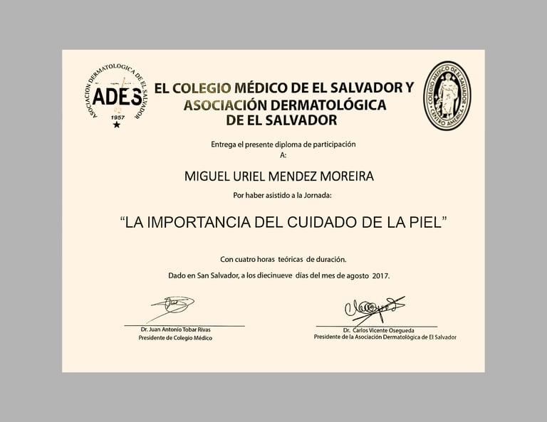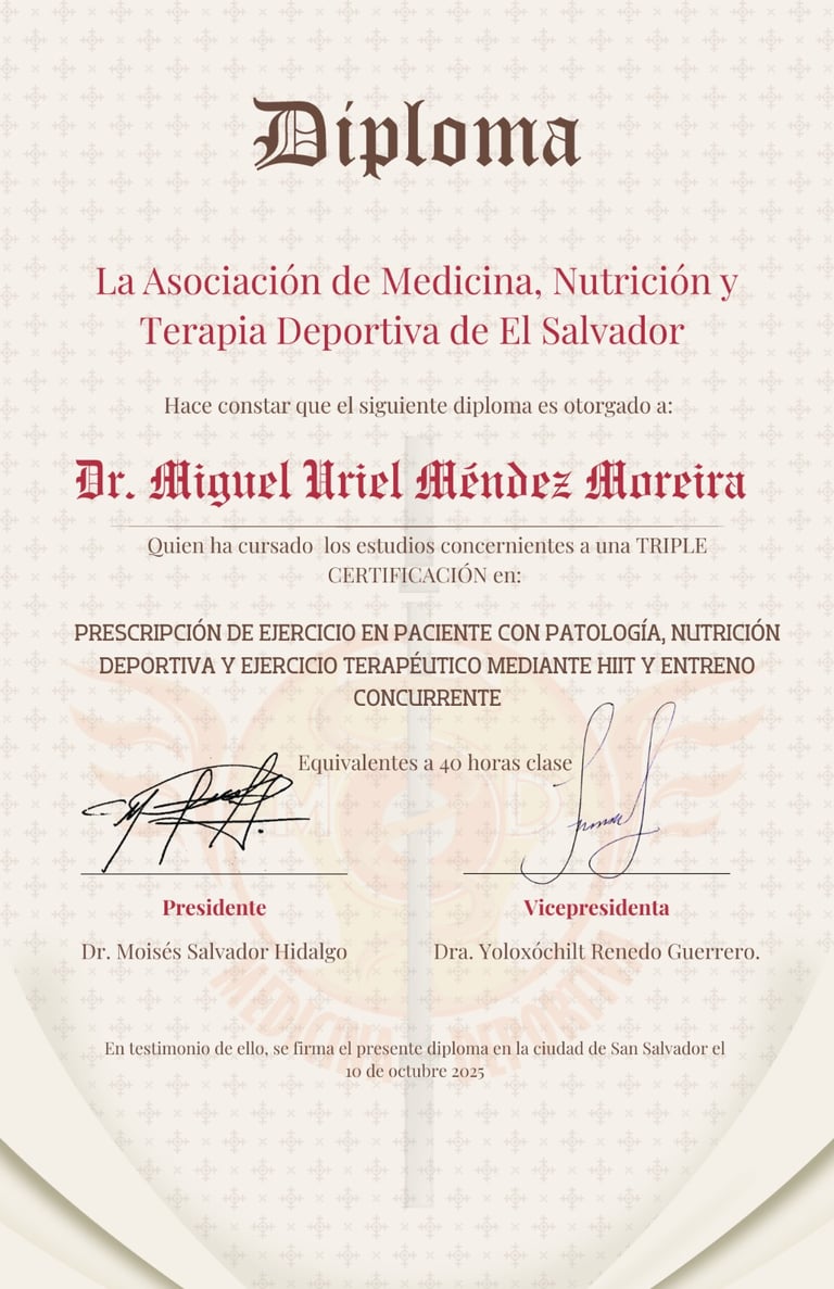 El Dr. Miguel Méndez se graduó en la carrera de Doctorado en medicina en la Universidad Evangélica de El Salvador en el año 2018. Cuenta con una sólida trayectoria profesional internacional, habiendo formado parte del staff clínico de la Universidad de Texas en Austin, en el Departamento de Medicina Deportiva y Emergencias, así como del staff clínico de Austin Diagnostic Clinic y Capital Medical Clinic en Estados Unidos