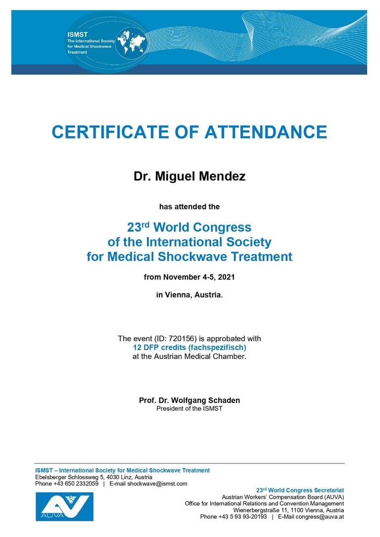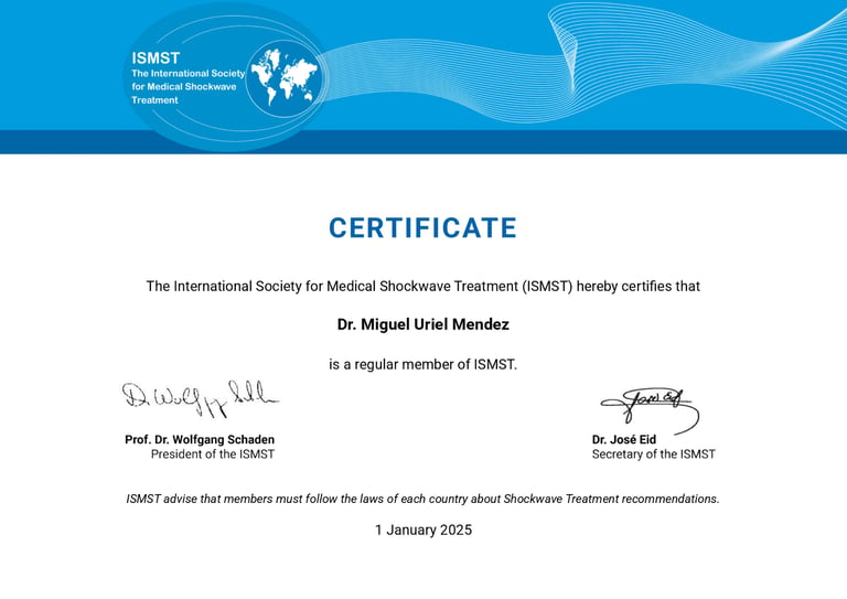 El Dr. Miguel Méndez es miembro de The International Society for Medical Shockwave Therapy (ISMST), organización líder a nivel mundial en la investigación y desarrollo de terapias con ondas de choque. También colaboró en el Departamento de Investigación en Urología con Urology America, desempeñándose como Research Assistant, fortaleciendo su experiencia en investigación clínica aplicada y protocolos médicos internacionales.
